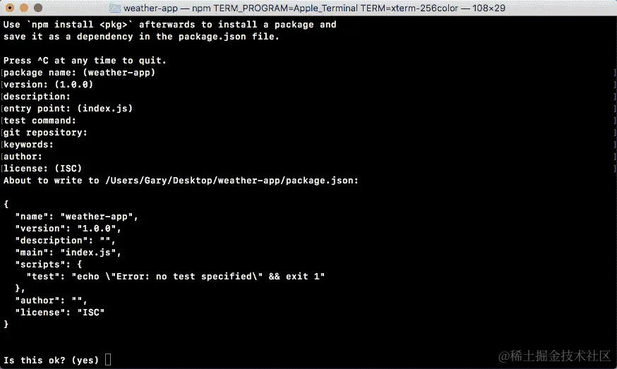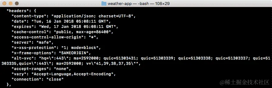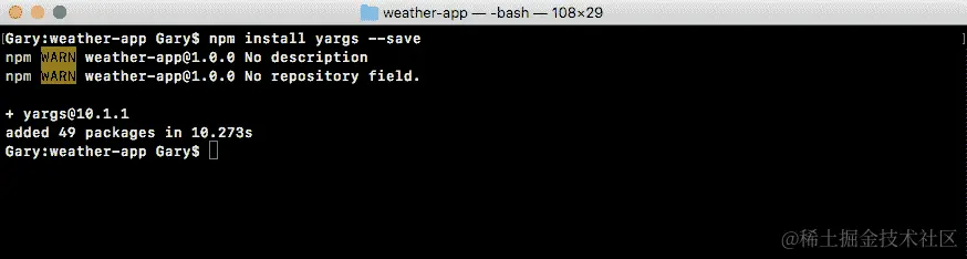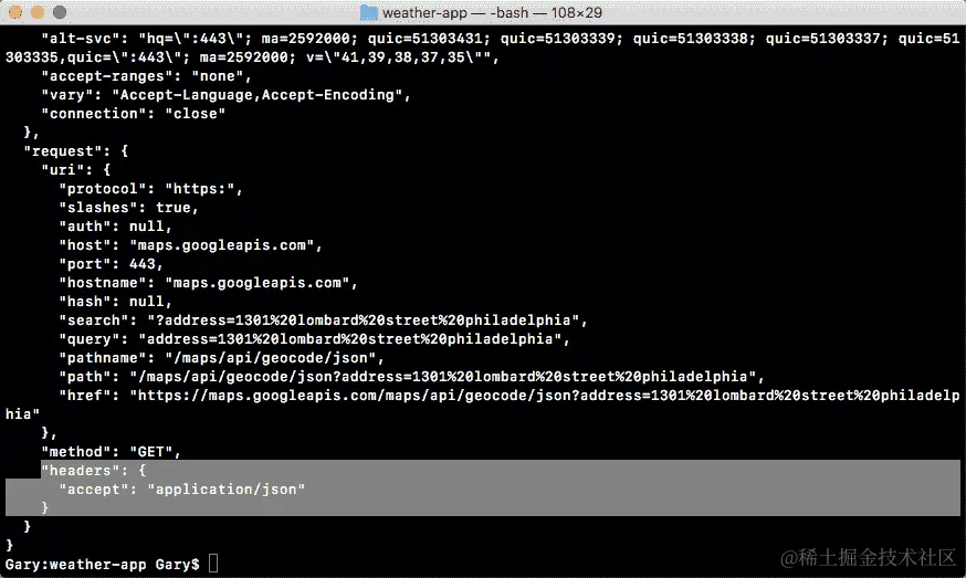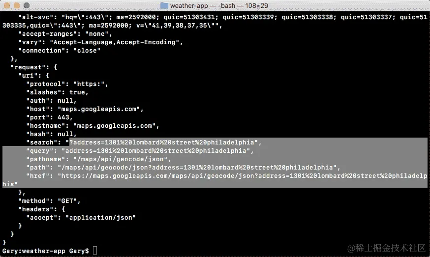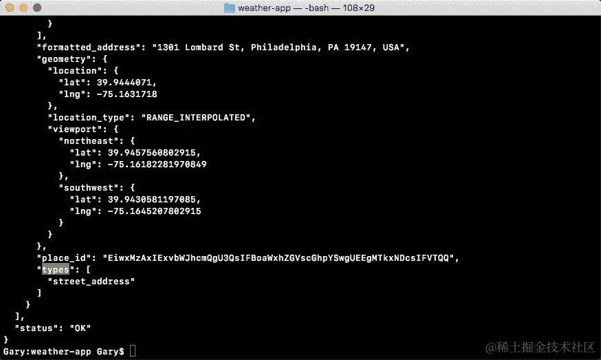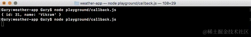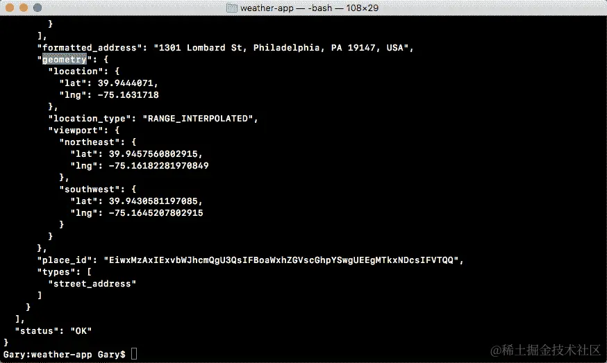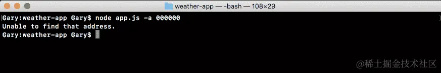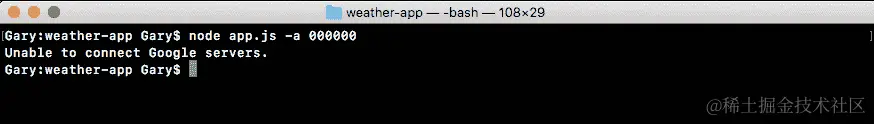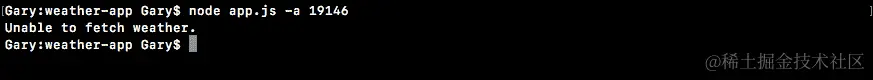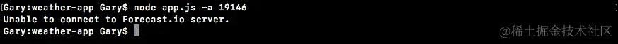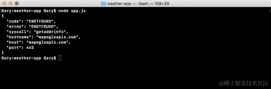 这就是我们需要做的一切,将数据从geocodeAddress传递给getWeather。这将创建一个在终端中打印我们动态天气的应用程序。