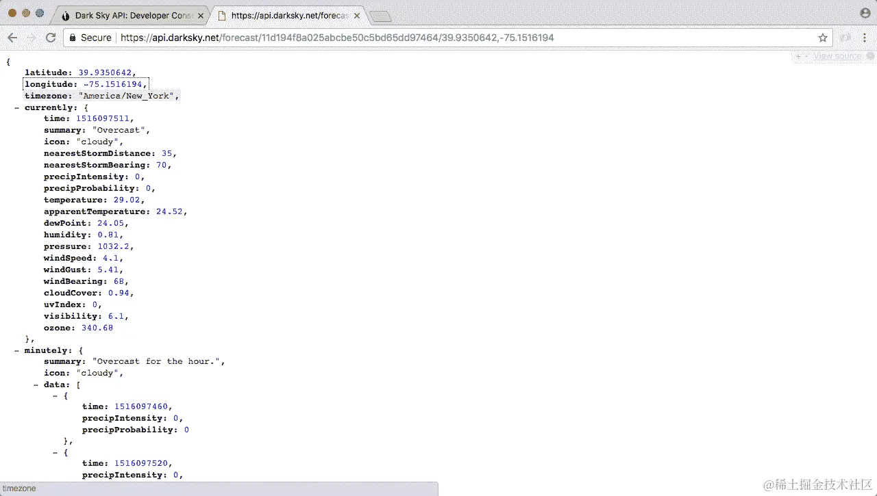 首先,我们需要传入纬度。我们将从weather.js中的 URL 中获取静态数据,复制它,并将其粘贴到app.js的参数列表中作为第一个参数。接下来是经度。我们将从 URL 中获取它,复制它,并将其粘贴到app.js中作为第二个参数: