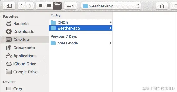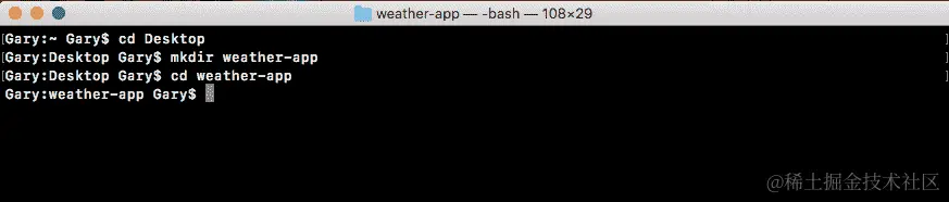 为此,我们只需要在桌面上创建一个新的文件夹。我会进入我的桌面并使用mkdir创建一个新目录,我会将其命名为weather-app。然后我只需要进入 weather app: