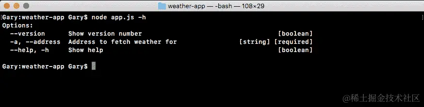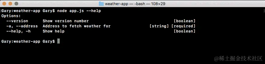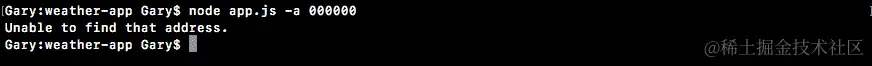 正如我之前提到的,后面将有参数。现在我们将把它们留空。我们可以从终端运行我们的文件。这意味着我们应该看到我们在上一节中硬编码的坐标的天气打印出来。因此,我们将运行node app.js。因为我们没有注释掉 yargs 代码,所以我们需要提供一个地址。因此,我们将添加一个虚拟地址。我将使用新泽西州的邮政编码: