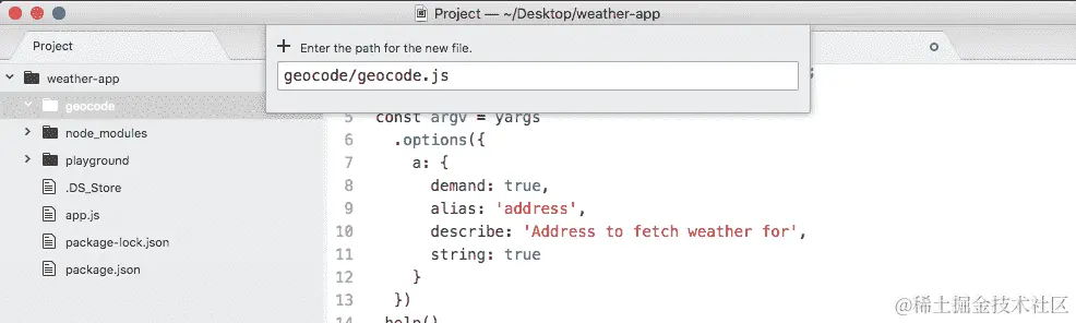 在这一节中,我们将把我们在上一节中创建的代码分解成自己的文件。类似于我们在调用geocodeAddress时所做的地理编码 API 请求,而不是实际在app.js中进行请求调用。这意味着我们将创建一个新文件夹,一个新文件,并在其中创建一个导出的函数。