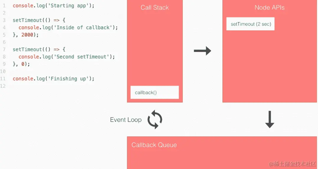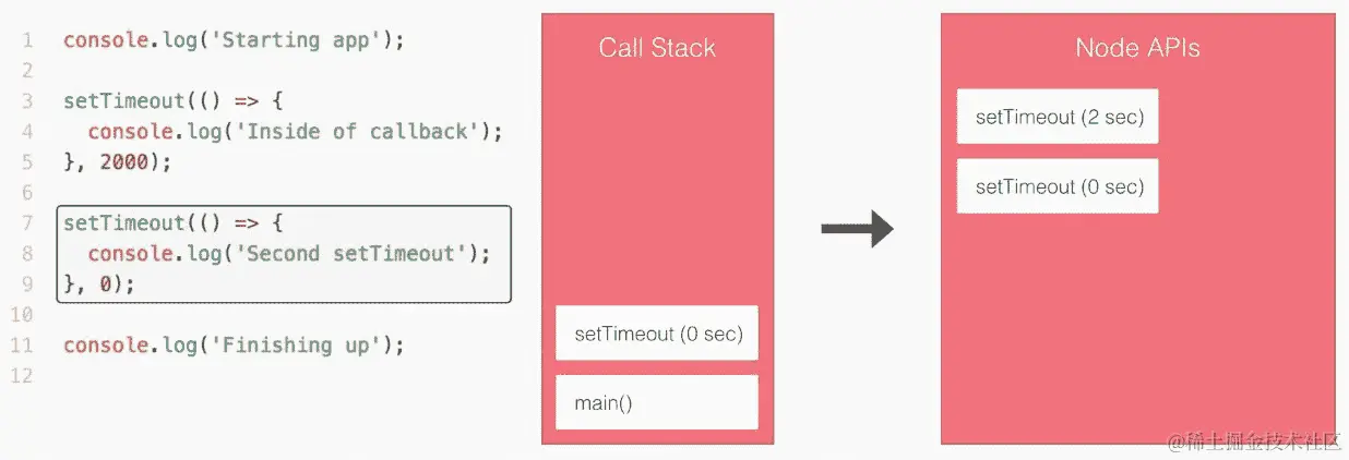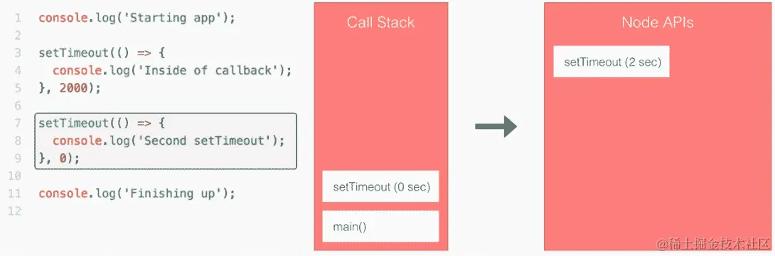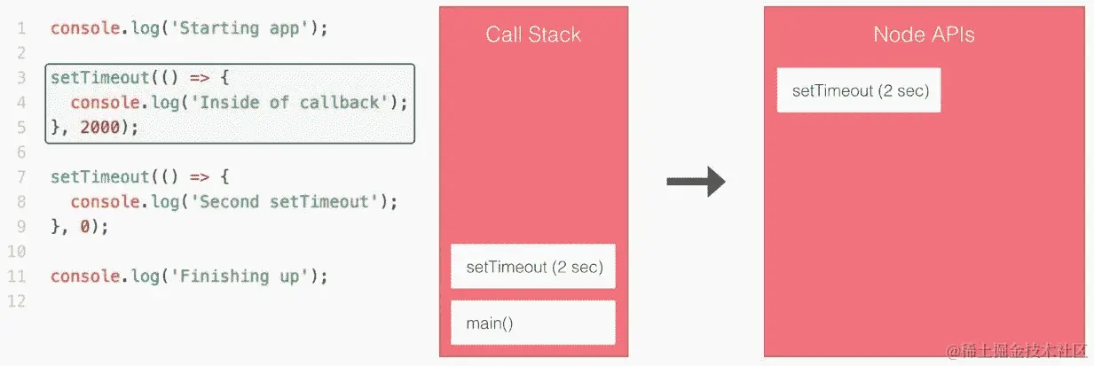 当我们调用setTimeout (2 sec)函数时,实际上是在 Node APIs 中注册事件回调对。事件就是等待两秒,回调函数是我们提供的函数,也就是第一个参数。当我们调用setTimeout时,它会像下面这样在 Node APIs 中注册: