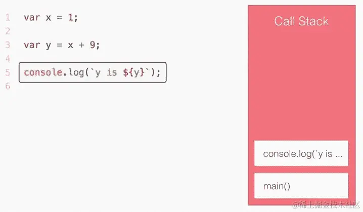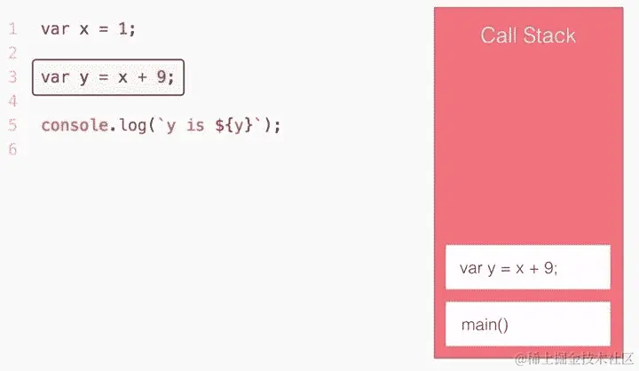 注意它出现在 main 的上面。现在这个语句将运行,创建变量。一旦完成,我们可以将其从调用堆栈中移除,并继续下一个语句,其中我们将变量y设置为x,x是1加9。这意味着y将等于10: