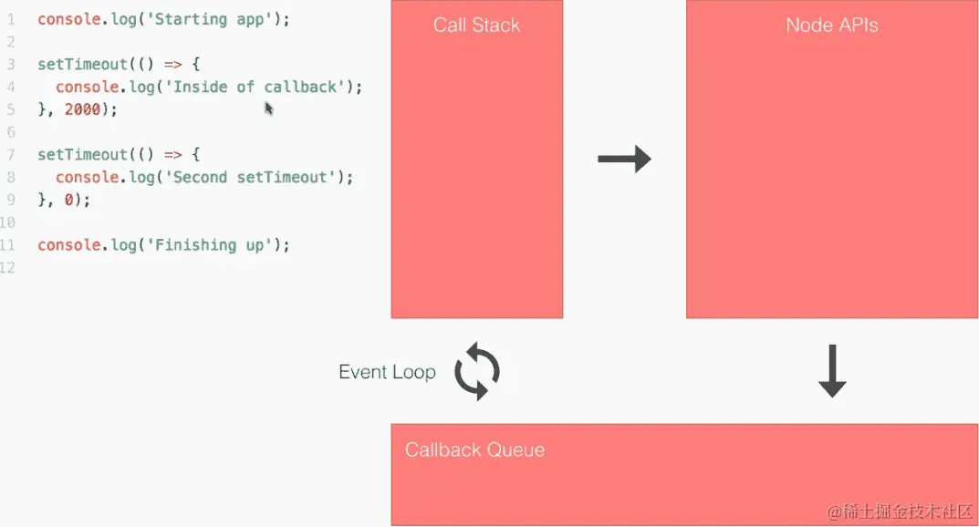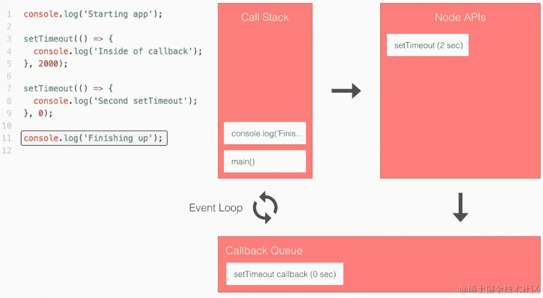 我们从Starting app开始,这是有道理的,它在顶部。然后我们得到Finishing up。在Finishing up之后,我们得到Second setTimeout,这似乎很奇怪,因为我们明确告诉 Node 我们希望在0毫秒后运行这个函数,这应该立即运行它。但在我们的示例中,Second setTimeout在Finishing up之后打印出来。