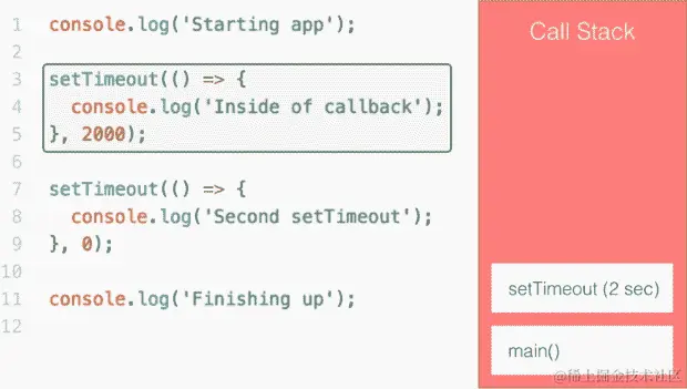 现在这个语句将结束,调用栈将继续执行,setTimeout将开始倒计时。setTimeout正在倒计时,并不意味着调用栈不能继续执行它的工作。调用栈一次只能运行一件事情,但即使调用栈在执行,我们也可以有事件等待处理。现在运行的下一个语句是另一个对setTimeout的调用: