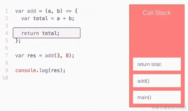 当你调用一个函数时,它会被添加到调用堆栈的顶部。当你从一个函数返回时,它会从调用堆栈中移除。