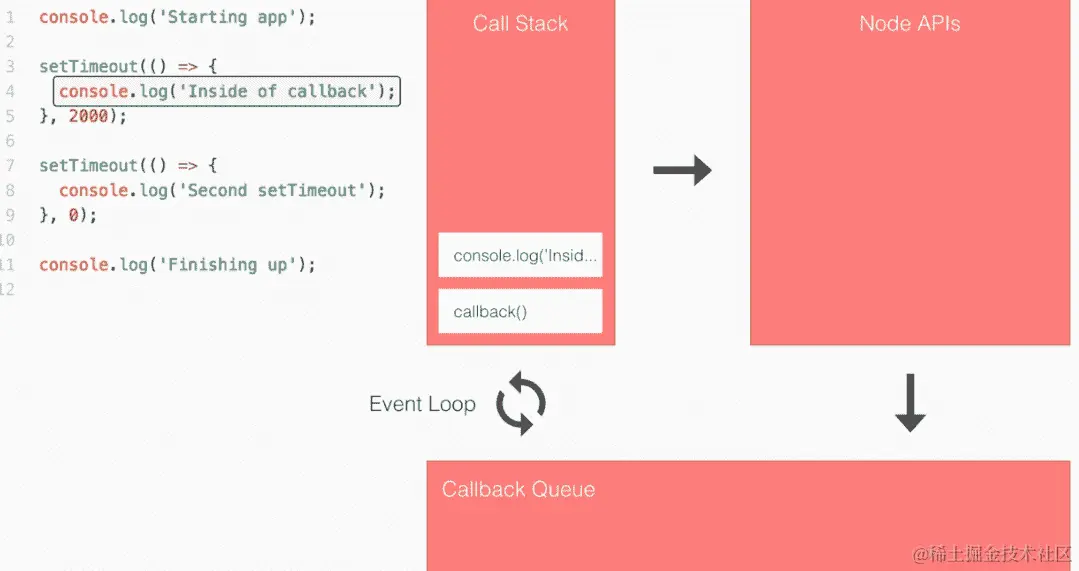 到目前为止,我们还没有使用 Node APIs、回调队列或事件循环。下一个示例将使用所有四个(调用栈、Node APIs、回调队列和事件循环)。如下面截图左侧所示,我们有一个异步示例,与上一节中写的完全相同: