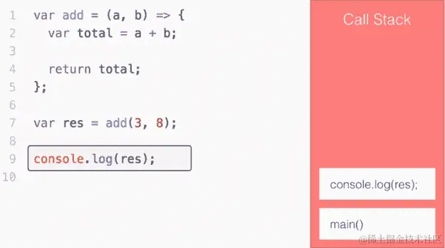 console.log语句将运行,将11打印到屏幕上并完成执行,现在我们已经到达主函数的末尾,在隐式返回时从调用栈中移除。这是程序通过 V8 调用栈运行的第二个示例。