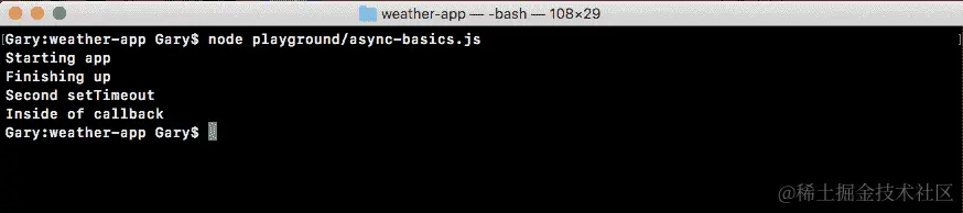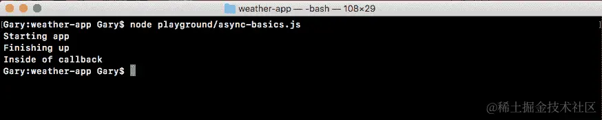 有了这个,我们实际上已经准备好运行我们的第一个异步程序了,我将不使用nodemon来执行它。我将使用基本的 Node 命令从终端运行这个文件;node playground和playground文件夹中的文件async-basic.js: