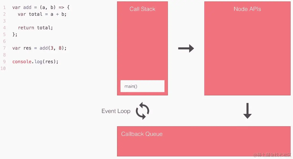 在这个示例中,我们将使用调用栈、Node APIs、回调队列和事件循环。所有这四个都将在我们的异步程序中发挥作用。现在事情将开始如你所期望的那样。首先发生的是我们将主函数添加到调用栈中运行。这告诉 V8 启动我们在上一截图左侧的代码,再次显示如下: