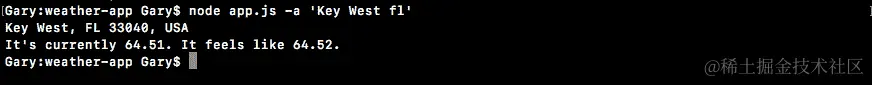 当我们运行这个命令时,我们确实得到了 Key West, FL 作为格式化的地址,当前温度是 64.51 度。体感温度是 64.52 度。