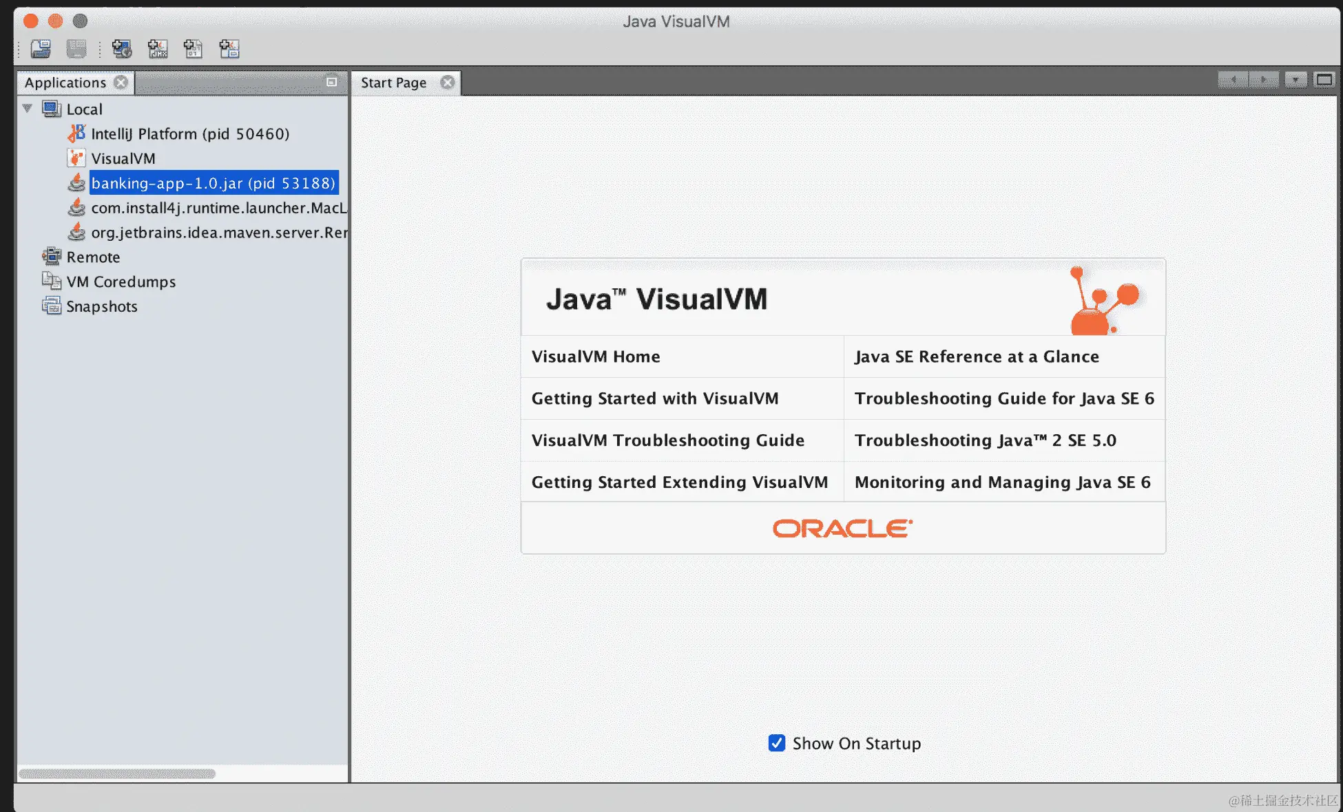 这是作为 JDK 的一部分集成的可视化工具,具有分析应用程序的能力。让我们运行我们之前章节中的银行应用程序,并查看我们可以使用它收集哪些信息。