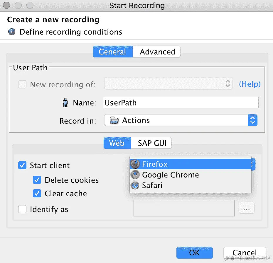 然后,我们将点击开始录制,并选择我们将用于记录应用程序的浏览器: