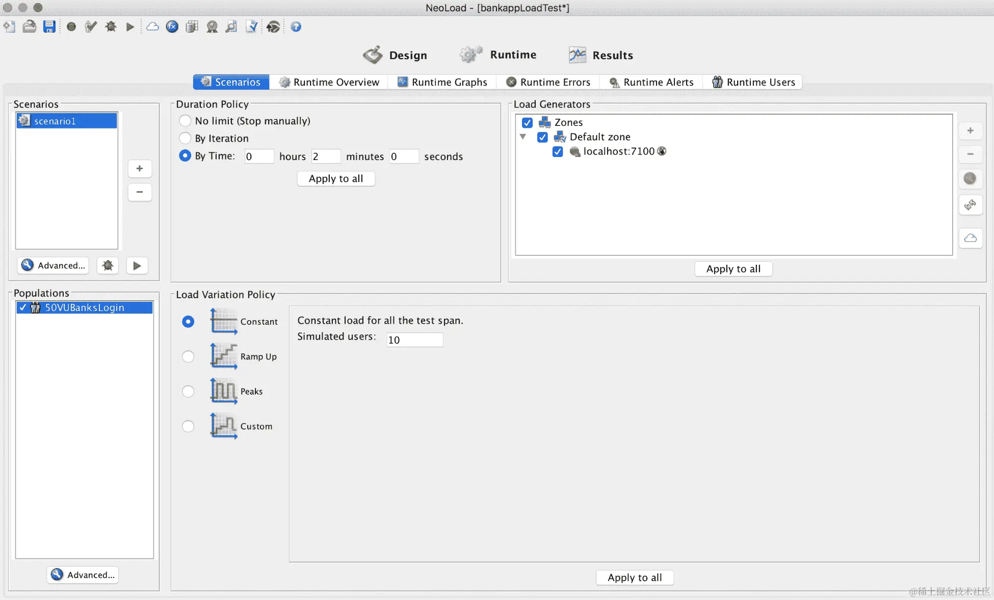 然后,点击运行时图标,以使用 10 个并发用户在 2 分钟内运行负载测试: