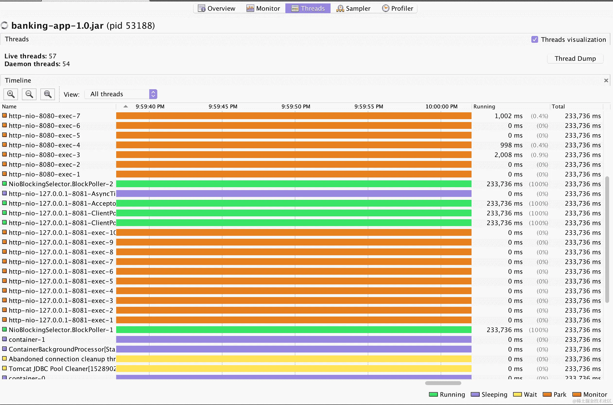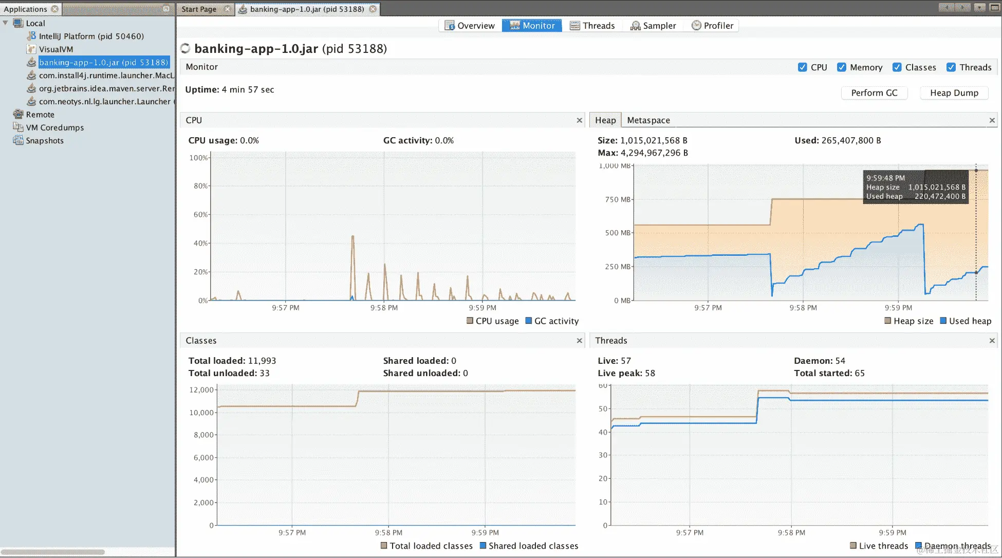 使用“本地”菜单选项,您必须附加要监视的 Java 进程。在这种情况下,我们将选择 banking-app-1.0.jar。然后,我们应该看到应用程序使用的资源的摘要: