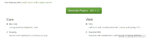 在“Dependencies”部分,我们将选择我们项目中需要的启动器和依赖项。Spring Boot 提供了简化 Maven 配置的启动器包。Spring Boot 启动器实际上是一组您可以包含在项目中的依赖项。您可以在搜索字段中键入依赖项的关键字,也可以点击“切换到完整版本”链接查看所有可用的依赖项。我们将通过选择两个依赖项——Web 和 DevTools 来启动我们的项目。您可以在搜索字段中键入依赖项,也可以切换到完整版本并查看所有可用的启动器包和依赖项: