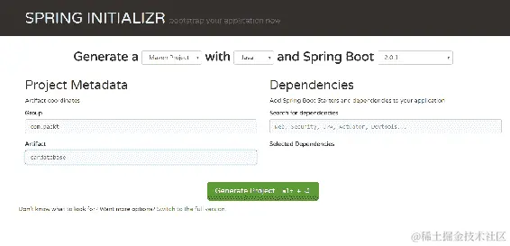我们将使用 Spring Intializr 创建我们的后端项目,这是一个用于创建 Spring Boot 项目的基于 Web 的工具。Spring Intializr 可以在start.spring.io找到: