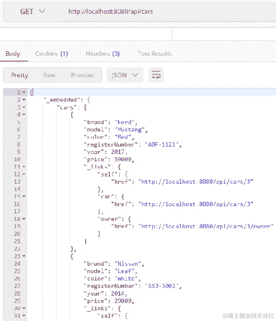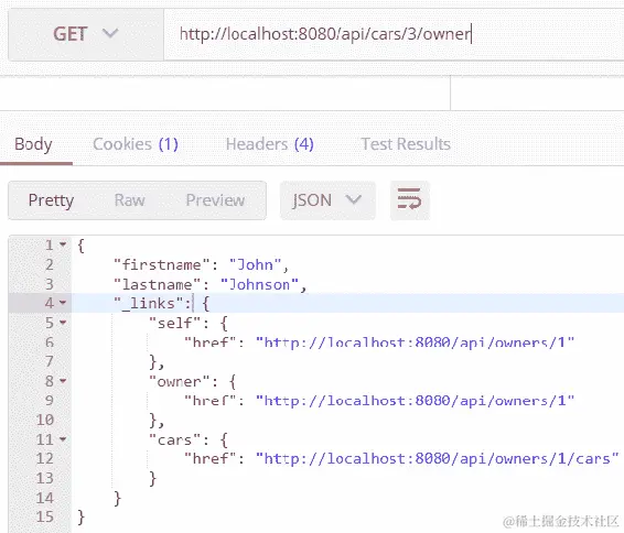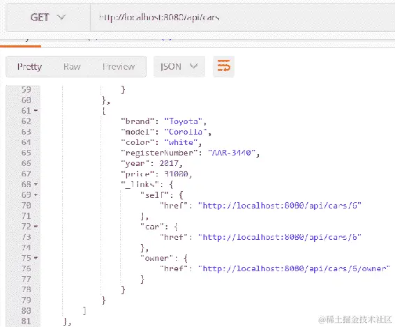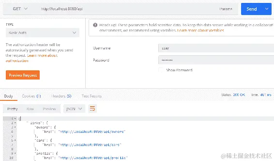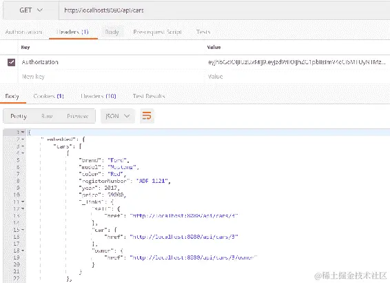 成功登录后,我们可以通过在Authorization标头中发送从登录接收到的 JWT 令牌来调用其他 RESTful 服务端点。请参见以下屏幕截图中的示例: