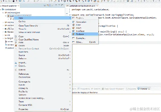 在左侧,我们有项目资源管理器,可以在其中查看项目结构和资源。项目资源管理器也用于双击打开文件。文件将在工作台中间的编辑器中打开。控制台视图位于工作台的下部。控制台视图非常重要,因为它显示应用程序的日志消息。
