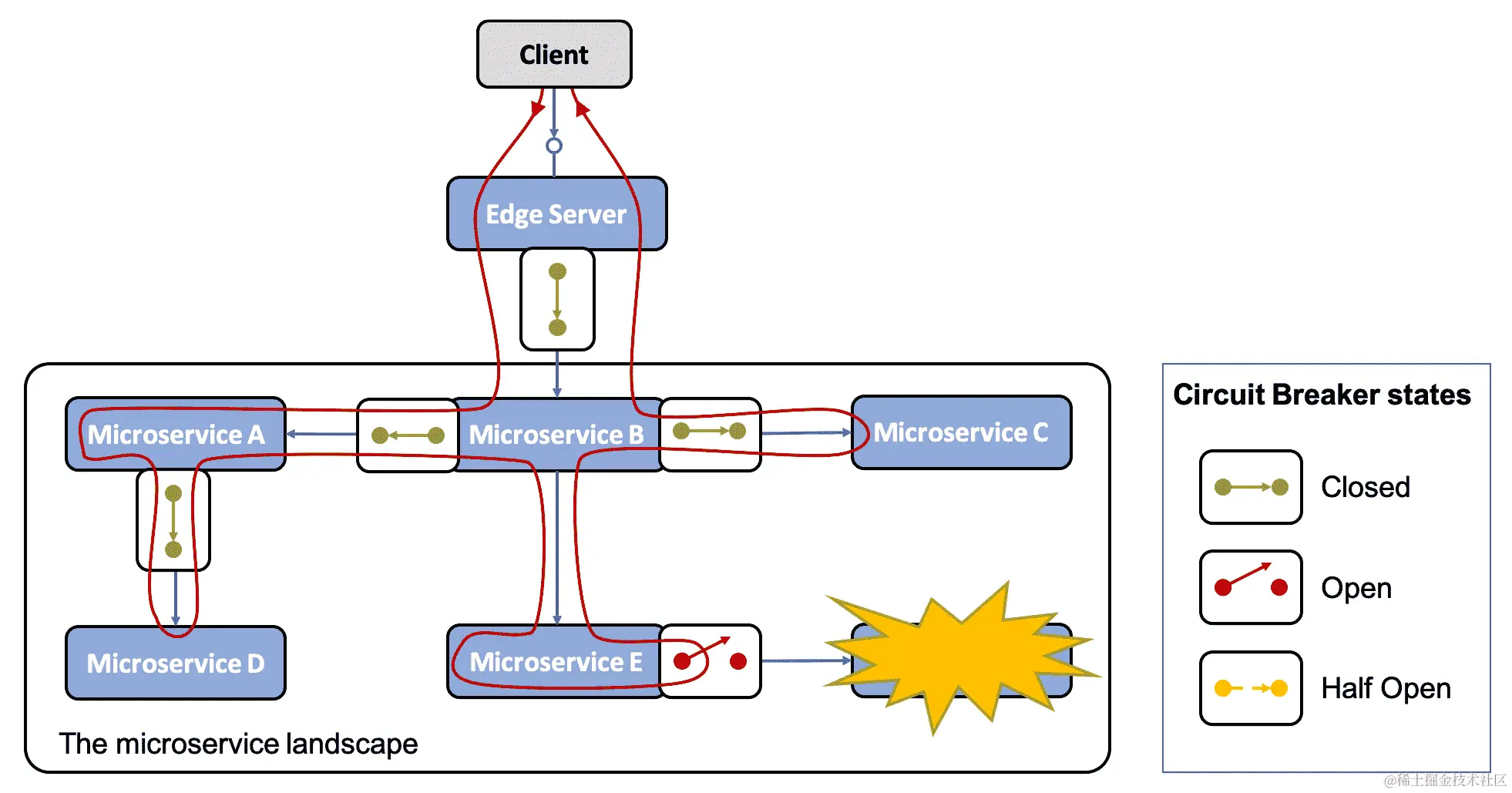 平台最初容易在与它通信的其他系统出现错误。如果一个系统没有及时响应从平台发送的请求,平台很快就会耗尽关键资源,例如,操作系统线程,特别是当暴露于大量并发请求时。这会导致平台中的组件挂起甚至崩溃。由于平台中的大多数通信基于同步通信,一个组件的崩溃可能会导致级联故障;也就是说,崩溃组件的客户端也可能在一段时间后崩溃。这被称为故障链。