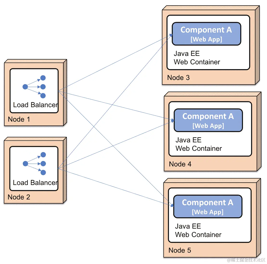 - 由于使用了定义良好的 API,平台中的每个组件也可以独立于其他组件扩展到多台服务器。扩展可以是为了满足高可用性要求或处理更高数量的请求。技术上,这是通过手动在运行 Java EE Web 容器的几台服务器前设置负载均衡器来实现的。一个组件 A扩展到三个实例的示例如下:
