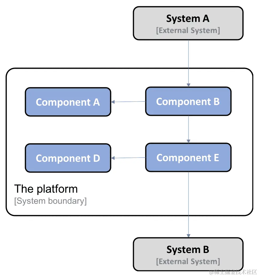 由于我无法讨论这个平台项目的特定功能,我将组件的名称进行了泛化,从组件 A 到 组件 F 进行标记。平台组成一组组件的如下所示: