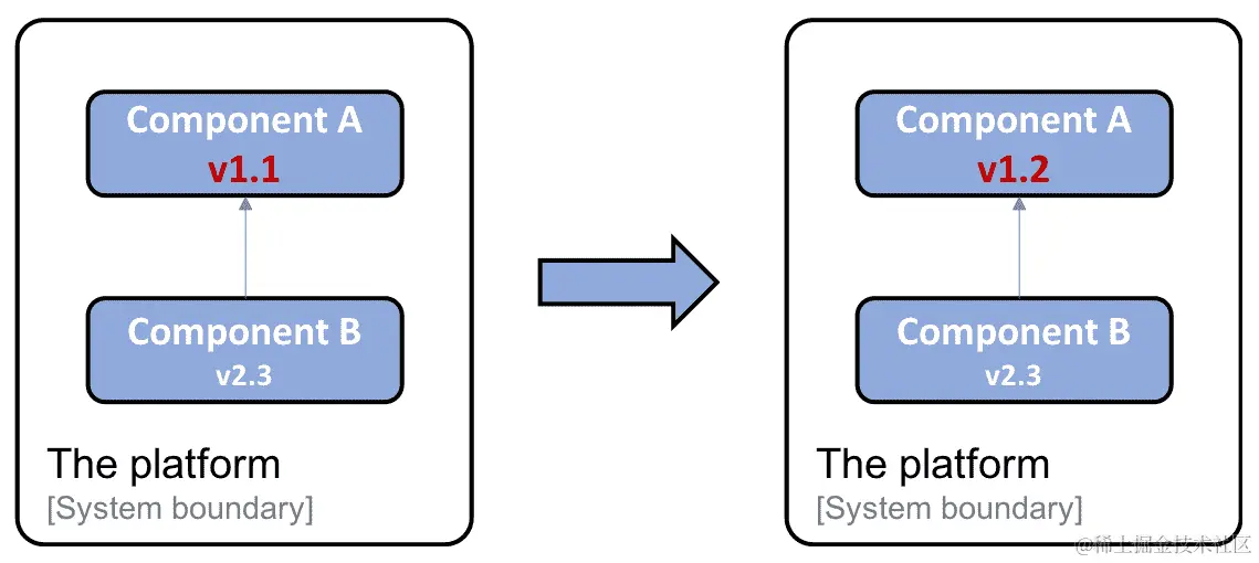 以下是一个示例,其中组件 A从版本v1.1升级到了v1.2。由于它使用了定义良好的 API 调用组件 A的组件 B,在升级后不需要更改(或者至少是向后兼容的):