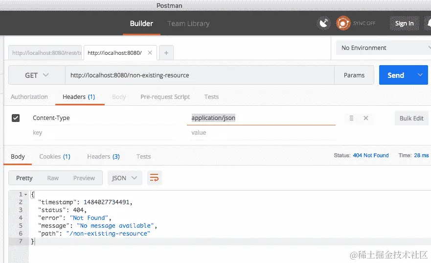 让我们使用一个头部(Content-Type:application/json)向http://localhost:8080/non-existing-resource发送一个GET请求。