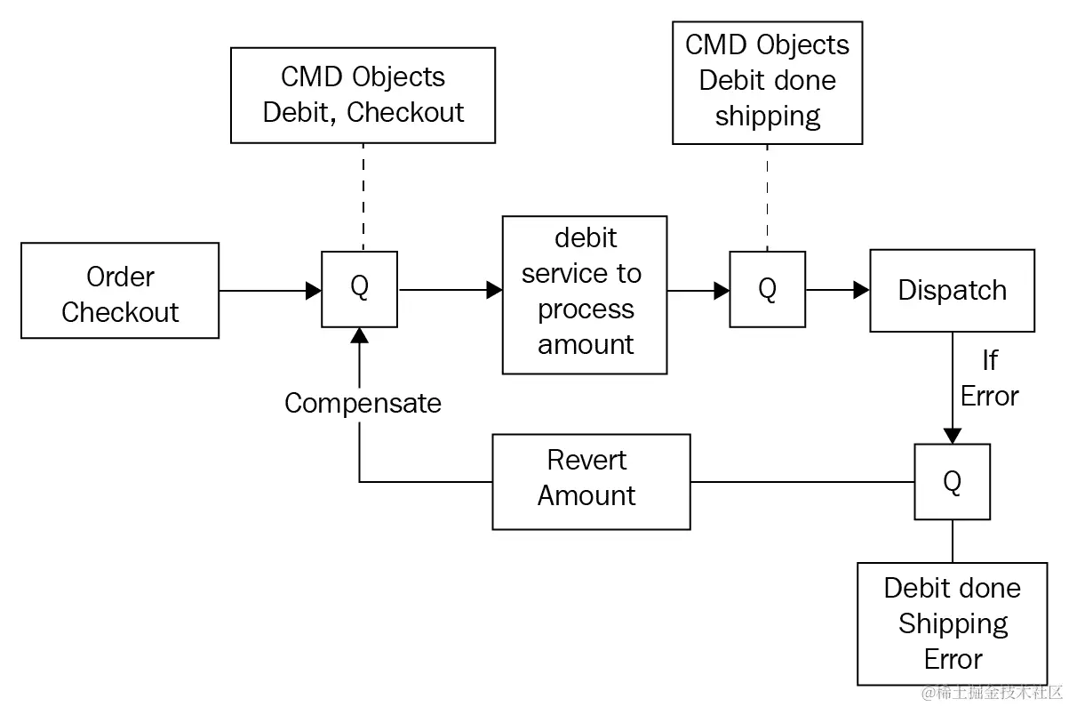 命令在任何微服务想要另一个微服务执行操作时使用。它们是同步的,通常使用 HTTP POST 或 PUT 请求来实现。例如,在前面的图中,奖励计划微服务向用户配置文件微服务或发票微服务发送命令,关于基于奖励的促销优惠。当发送命令失败时,发送者将不知道接收者是否处理了命令。如果发送方和接收方没有遵循一组规则,这可能导致错误或一些功能降级。