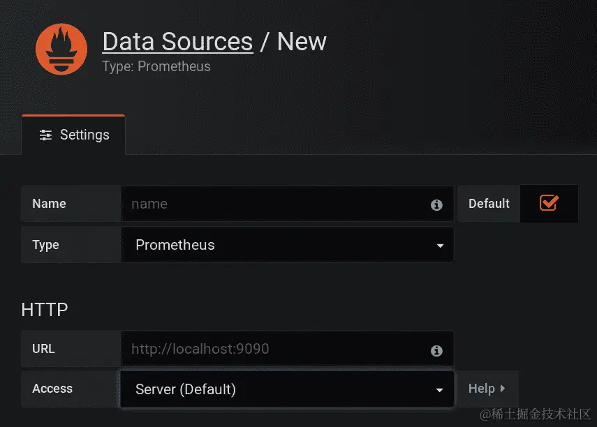 - 登录后,添加一个类型为 Prometheus 的数据源(打开“添加数据源”屏幕),并在 HTTP URL(您的 Prometheus 运行 URL)中输入 IP 地址: