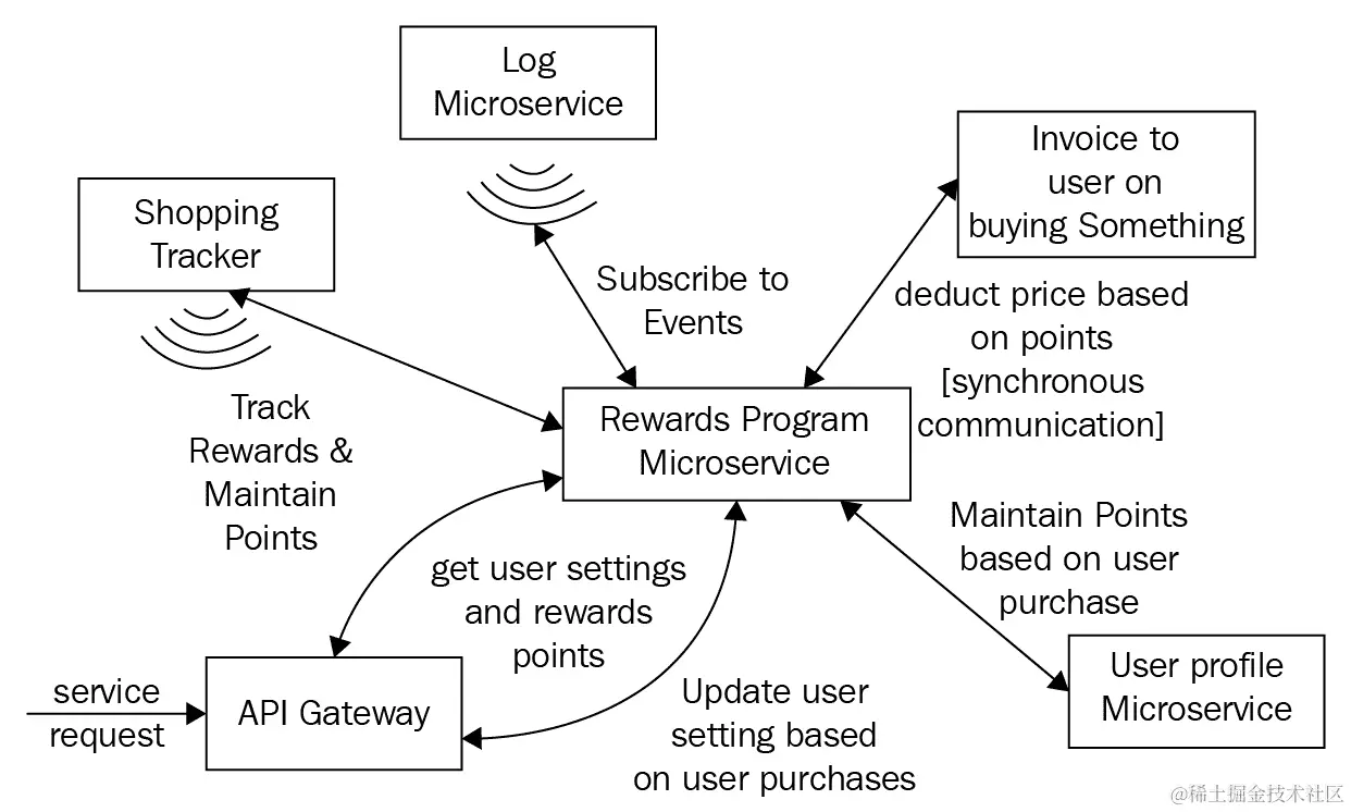 微服务因为粒度细和与范围紧密相关,需要以某种方式相互协作,以向最终用户提供功能。它们需要共享状态或依赖关系,或者与其他服务进行通信。让我们看一个实际的例子。考虑频繁购买者奖励计划微服务。这个微服务负责频繁购买者业务能力的奖励。该计划很简单——每当客户购买东西时,他们的账户中就会积累一些积分。现在,当客户购买东西时,他可以使用这些奖励积分来获得销售价格的折扣。奖励微服务依赖于客户购买微服务和其他业务能力。其他业务能力依赖于奖励计划。如下图所示,微服务需要与其他微服务协作: