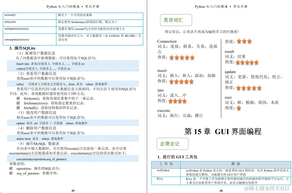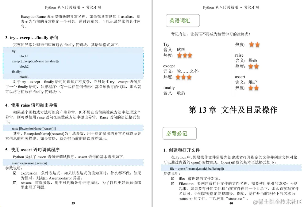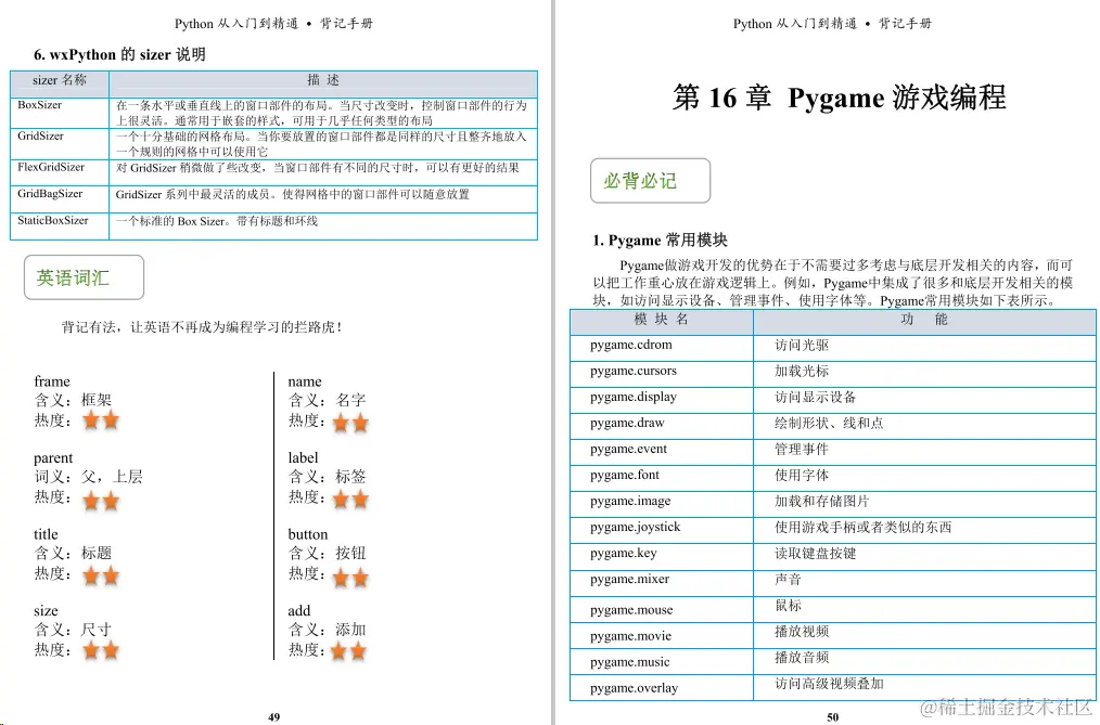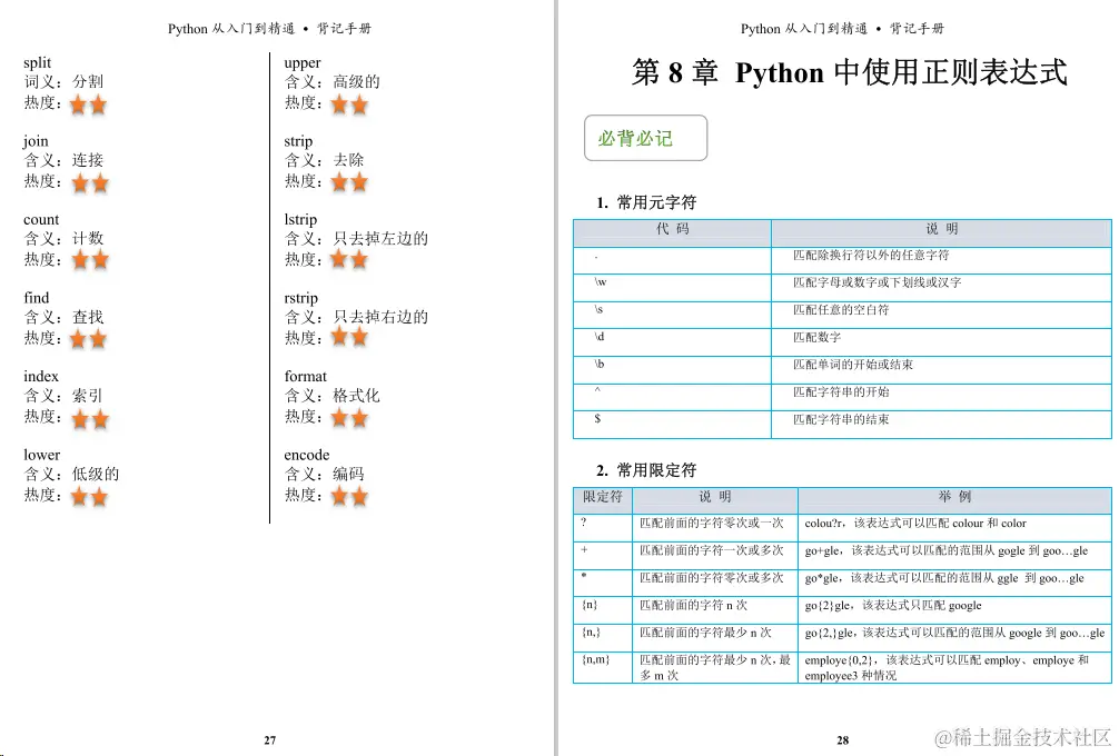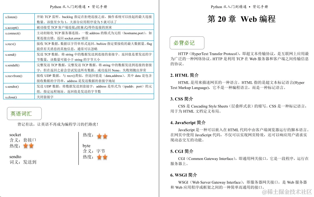 今天给小伙伴们带来的是一份足够精炼,但又浅显易懂的python教程《python背记手册》,这份教程主要主要分为21个章节,前十章是讲Python的基础知识,后十章主要介绍Pvthon的一些实操项目