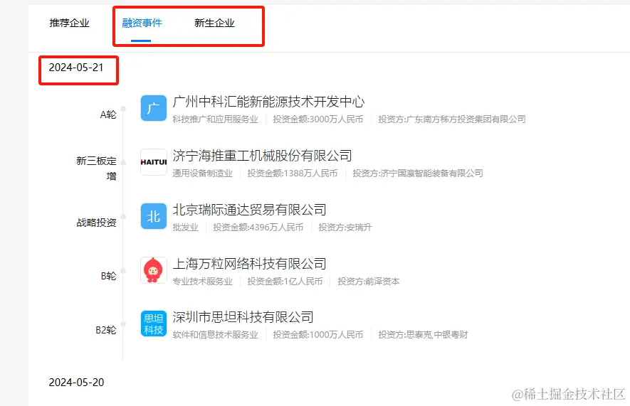 当然,网站首页上还有最新企业的融资事件及新生企业信息