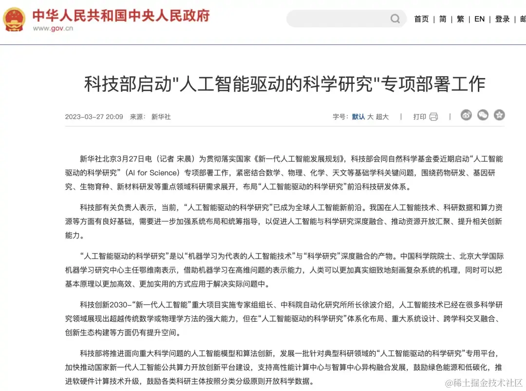 随后,我国政府及各级部门也面向 AI4S 出台了一系列利好政策。2023 年 3 月,为贯彻落实国家《新一代人工智能发展规划》,科技部会同自然科学基金委启动「人工智能驱动的科学研究」(AI for Science) 专项部署工作,紧密结合数学、物理、化学、天文等基础学科关键问题,布局人工智能驱动的科学研究前沿科技研发体系。