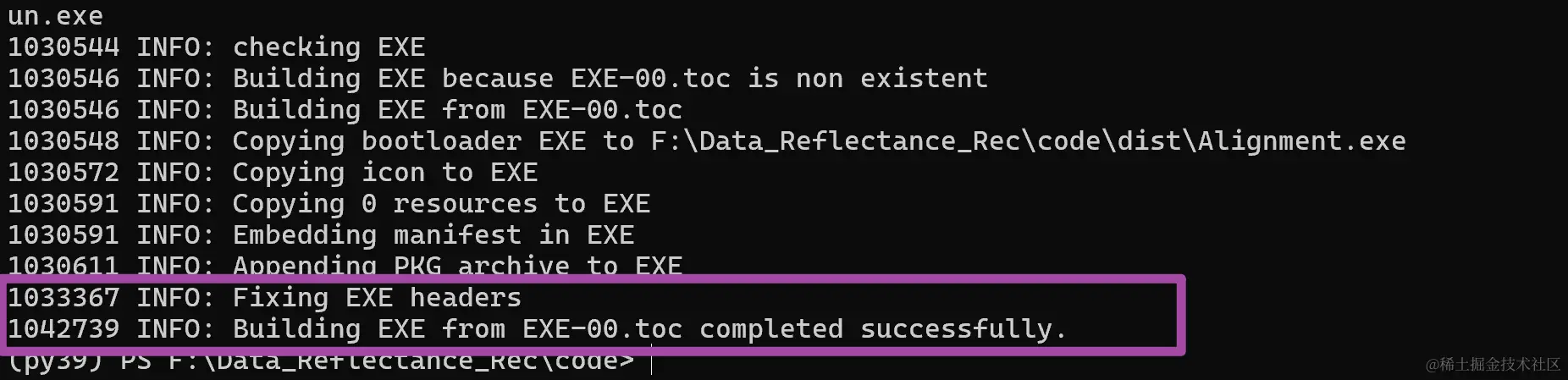 其中,-F表示对Alignment.py文件打包时,只生成唯一的1个.exe可执行文件;一般情况下,我们都是带上这个-F参数来运行打包命令的,因为只生成1个.exe可执行文件的话,更方便后期我们对这个可执行文件的分享。