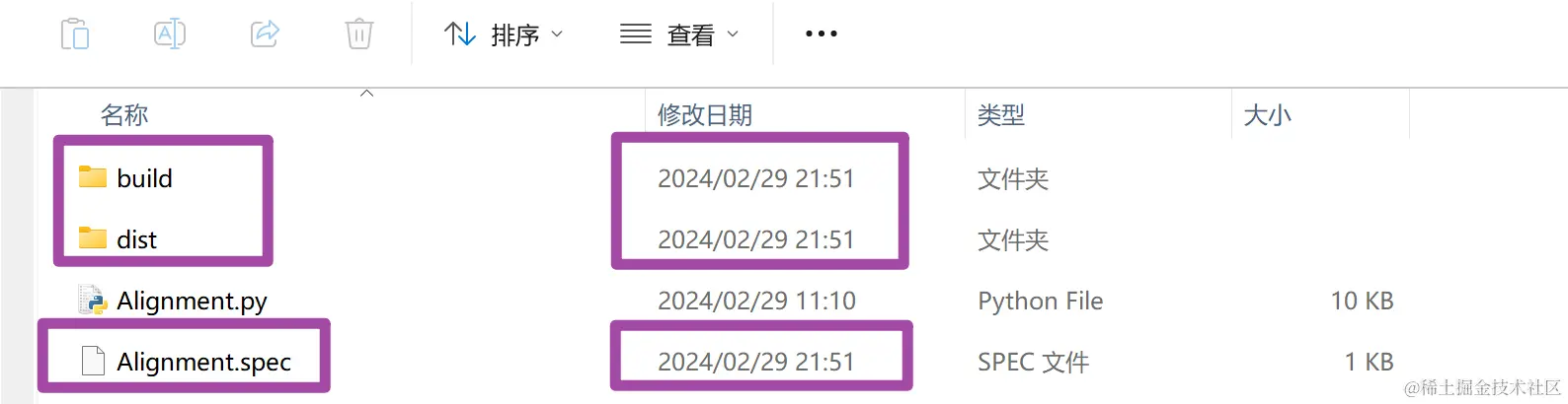 此时,我们在与待打包Alignment.py文件同目录的路径中,可以看到pyinstaller模块对其打包后生成的3个新的文件夹或文件,如下图所示。