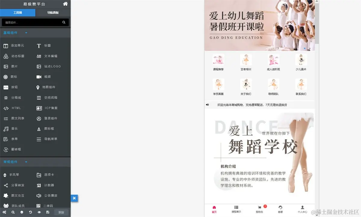 step2, 一键生成制作舞蹈艺考培训小程序商城,进入可视化编辑器可以对站点文案图片进行修改