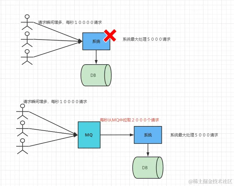 3)削锋填谷:使用了MQ之后,限制消费消息的速度为2000,这样一来,高峰期产生的数据势必会被积压在 MQ中,高峰 就被“削”掉了。