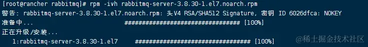 [root@rancher rabbitmq]# rpm -ivh rabbitmq-server-3.8.30-1.el7.noarch.rpm