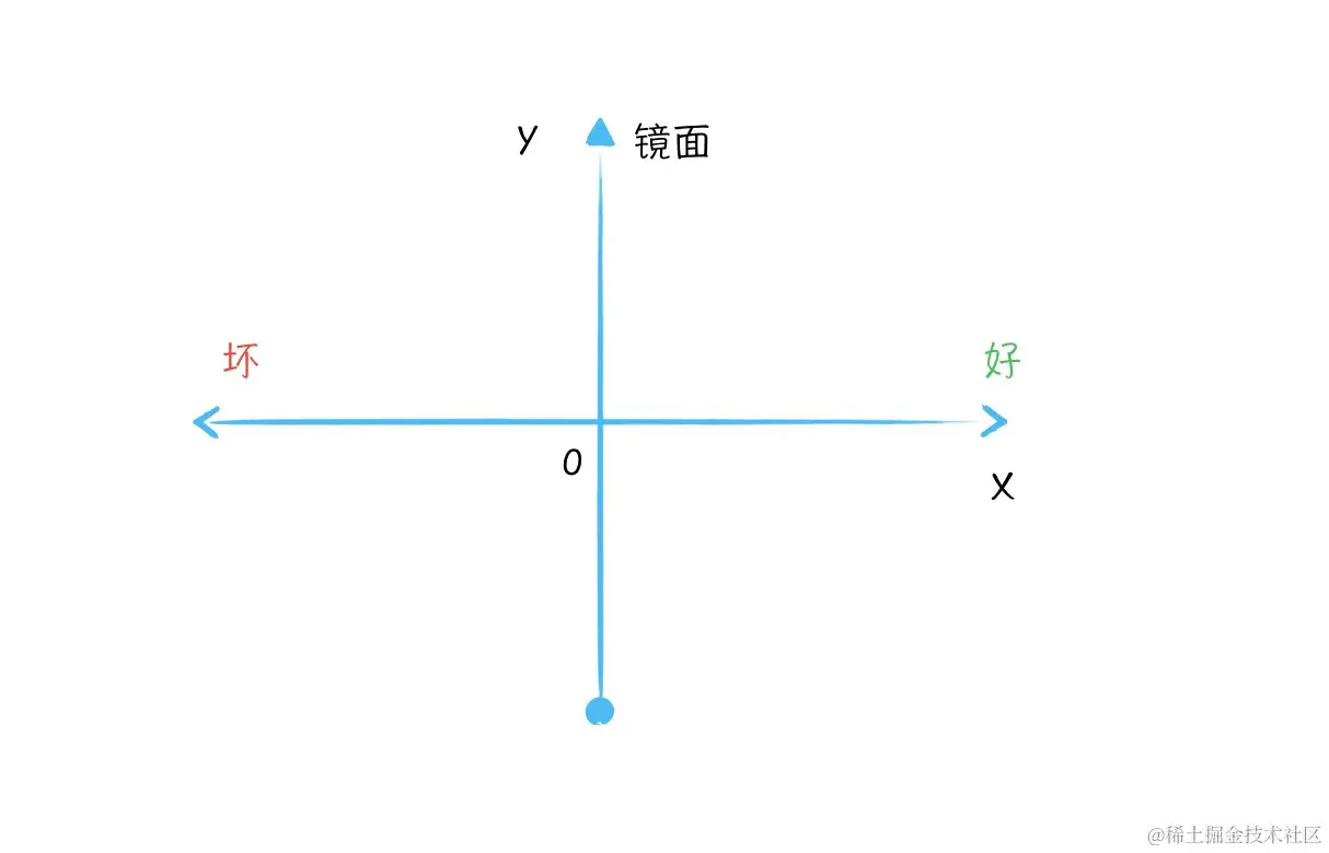 一个人的行为可能因情境和动机的不同而表现出不同的好坏程度。同样的小错误,在好人身上可能受到严厉的指责,而在被认为有改过之心的“坏人”身上,却可能被视为具有教育的价值,前者是否定,而后者则是肯定。为了更具体地理解这种变化,我倾向于将好坏程度具象化:X轴正半轴代表好的程度,负半轴则代表坏的程度,其绝对值的大小反映了好坏的程度。如果以Y轴为镜面对称,那么好坏之间的转变将呈现相对程度的对称变化。