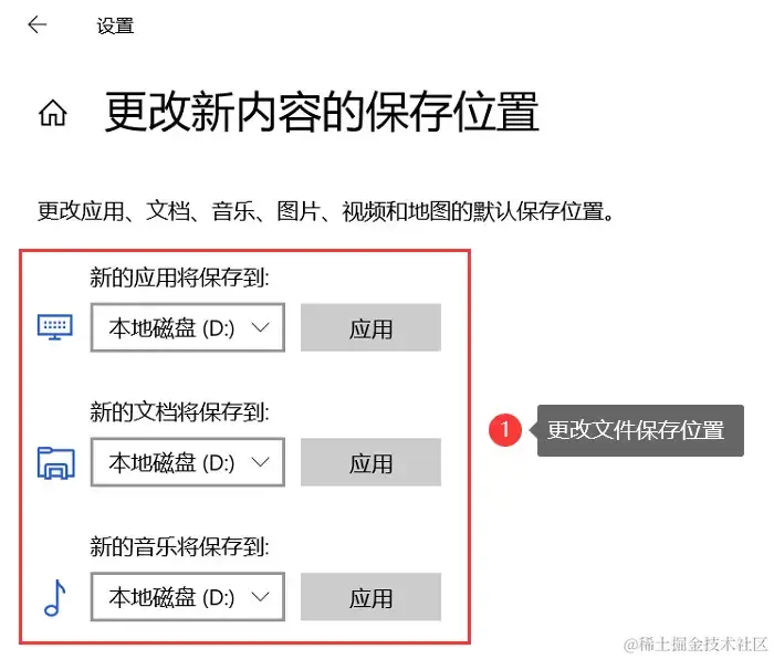 步骤3:选择新的保存位置(如D盘),然后点击 【应用】 。