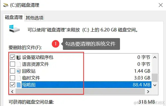 步骤1:在磁盘清理窗口中,点击需要清理的系统文件;