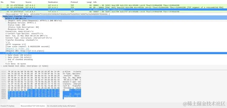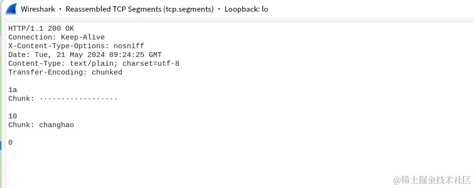 在抓包中已经看到服务端的HTTP响应包,响应Body中已经返回了 chunked