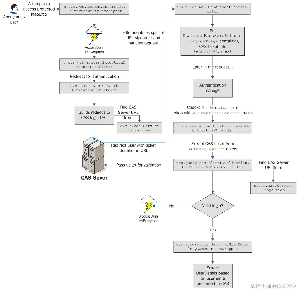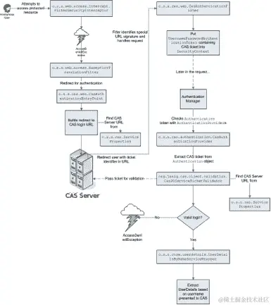 请注意,一旦验证通过,Spring Security CAS 不再需要 CAS 服务器,除非用户需要重新验证。这意味着存储在应用程序中用户Authentication对象中的属性和其他用户信息可能会随时间变得过时,并且可能与源 CAS 服务器不同步。请注意适当地设置会话超时,以避免这个潜在的问题!