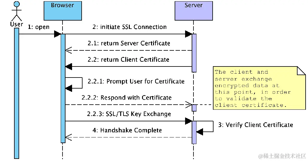 下面的序列图说明了客户端浏览器与 Web 服务器协商 SSL 连接并验证用于相互认证的客户端证书的信任时的交互: