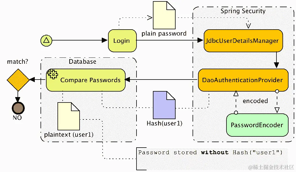 如以下图表所示,当用户提交密码时,Spring Security 哈希提交的密码,然后将其与数据库中的未哈希密码进行比较: