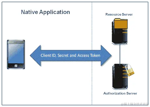 - 原生应用: 原生应用与基于用户代理的应用类似,不同之处在于这些应用是安装在资源所有者的设备上并原生执行的,而不是从网络服务器下载并在用户代理中执行。您在手机上下载的许多原生应用都属于原生应用类型。在这里,平台确保设备上的其他应用不能访问其他应用的凭据和访问令牌。此外,原生应用不应与与原生应用通信的服务器共享客户端凭据和 OAuth 令牌,如下面的图所示: