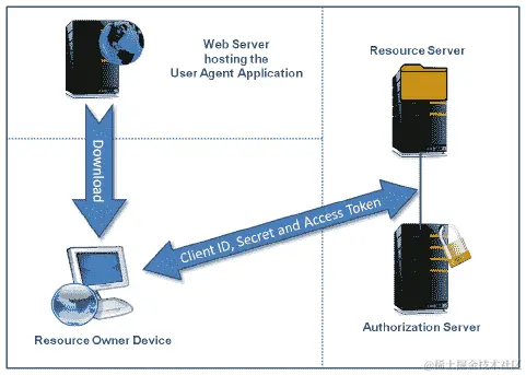 - 基于用户代理的应用: 基于用户代理的应用是公共客户端类型。在这种情况下,应用位于网络服务器上,但资源所有者将其下载到用户代理(例如,网络浏览器)上,然后在该设备上执行。在这里,下载并驻留在资源所有者设备上的用户代理中的应用与授权服务器通信。资源所有者可以访问客户端凭据和访问令牌。游戏应用是此类应用配置的一个很好的例子。用户代理应用流程如下所示: