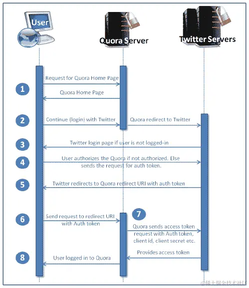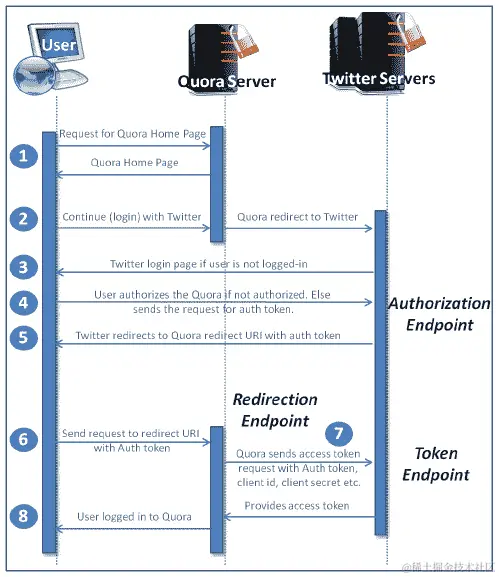 资源服务器托管受保护的资源。它应该能够使用访问令牌服务于这些资源。以 Quora 使用 Twitter 登录为例,Twitter 是资源服务器。