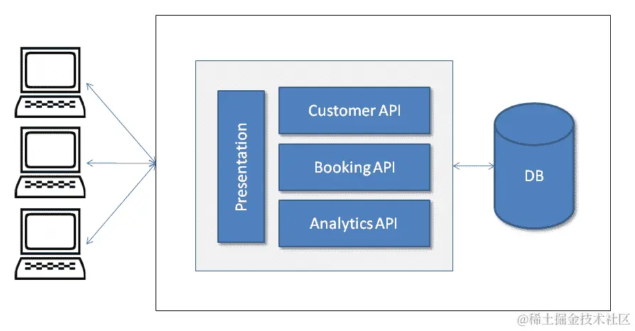 单体架构允许开发不同的组件,如表示层、应用逻辑、业务逻辑和数据访问对象 (DAO),然后你可以将它们捆绑在企业存档 (EAR) 或网络存档 (WAR) 中,或者将它们存储在单个目录层次结构中(例如,Rails、NodeJS 等)。